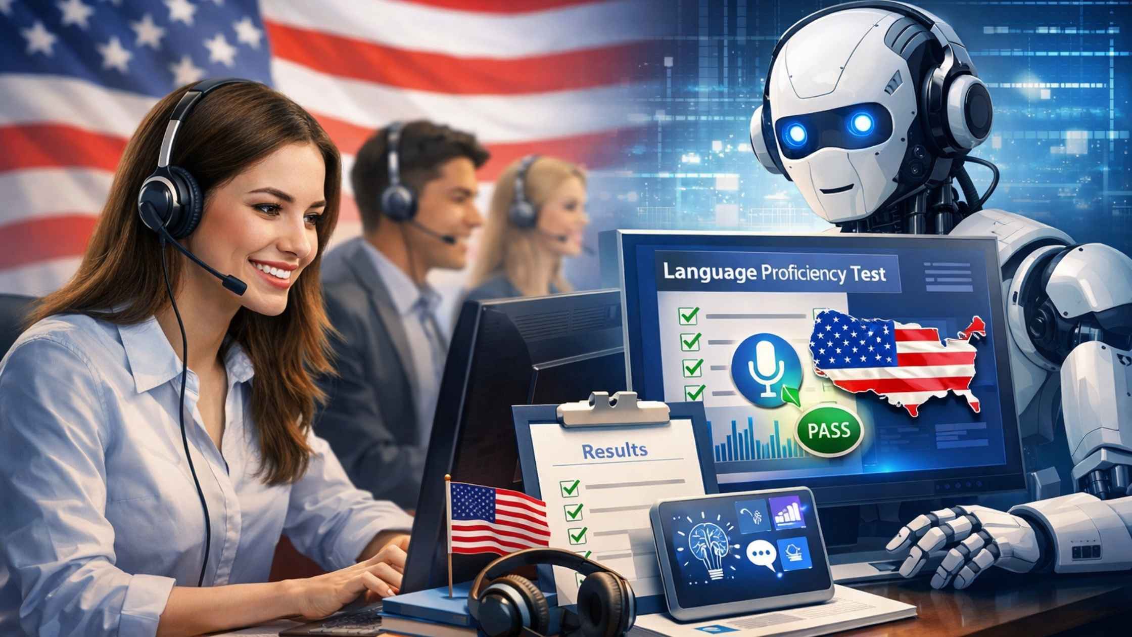 - Full-spectrum evaluation — Reading, writing, listening, and speaking in realistic call-center scenarios